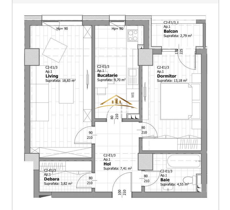 Compartimentare: Living – 18.83 m² / Dormitor – 13.18 m² Hol – 7.41 m² / Bucătărie- 9.70 m² / Baie- 4.55 m², Debara – 3.82 m² Balcon – 2.79 m².