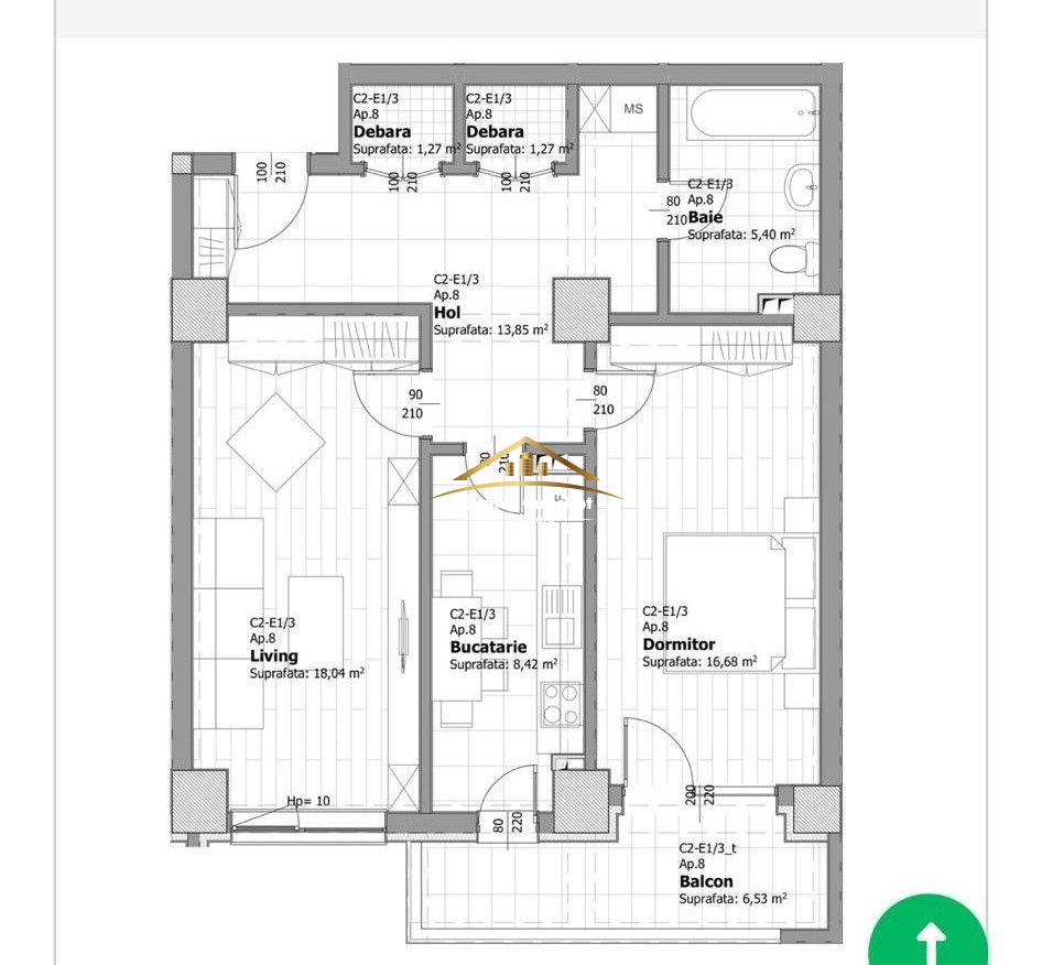 Compartimentare: Living – 18.04 m² / Dormitor – 16.68 m² Hol – 13.85 m² / Bucătărie- 8.42 m² / Baie- 5.40 m², Debara 1 – 1.27 m², Debara 2 – 1.27 m², Balcon – 6.53 m².
