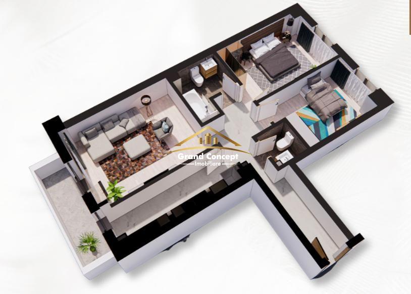 Compartimentare: Living – 18.20 mp / Dormitor – 12.45 mp / Dormitor – 10.95 mp Hol – 10.55 mp / Bucătărie- 8.50 mp / Baie- 4.55 mp / Baie- 1.95 mp / Balcon – 4.75 mp.