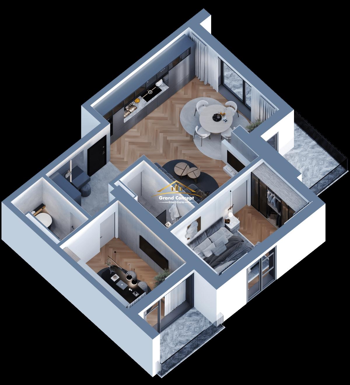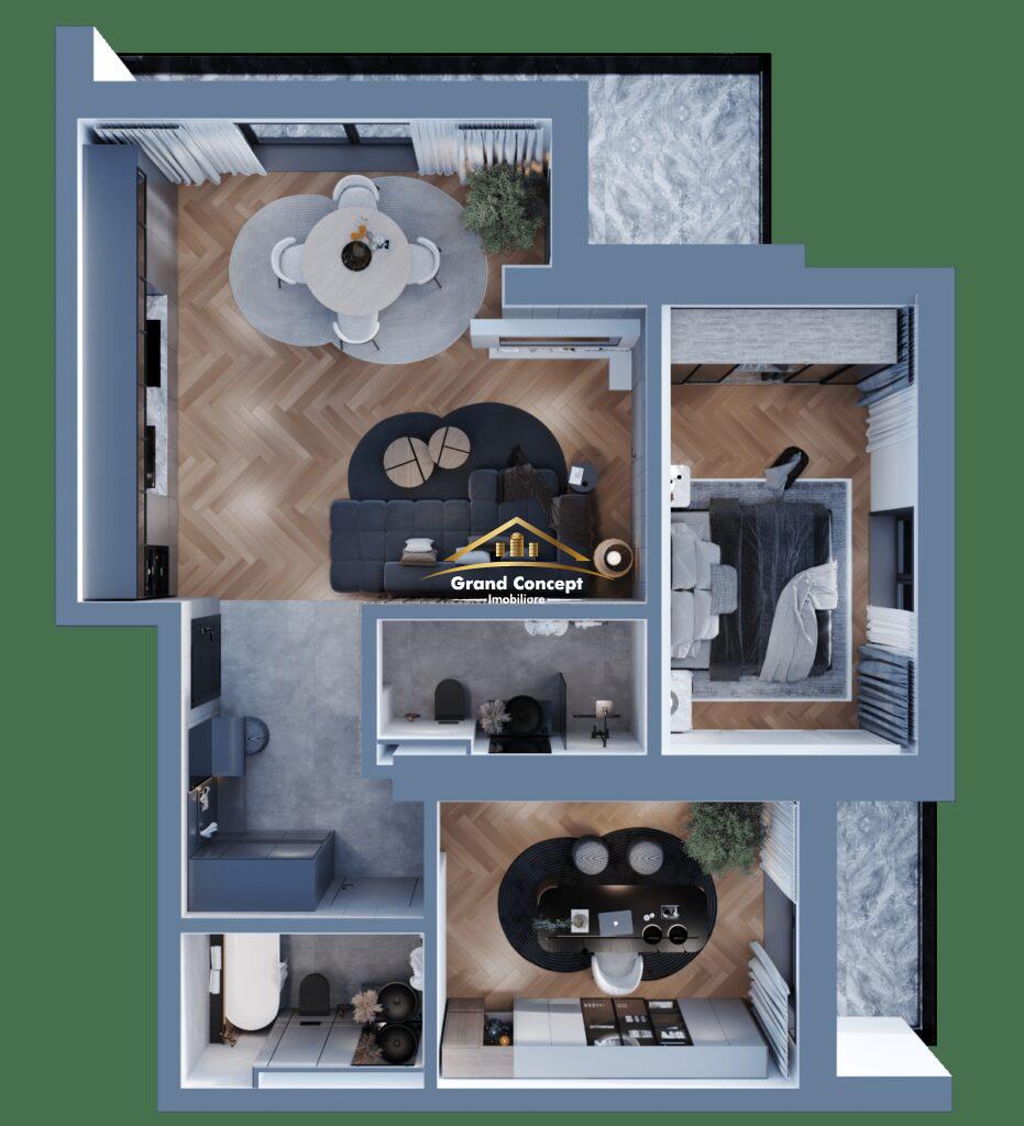 Living si bucatarie 30.35 mp, Dormitor 13.70 mp, Dormitor 12.40 mp, Baie 4.50 mp, Baie 4.35 mp, Hol 7.60 mp, Balcon 4.05 mp, Balcon 9.05.