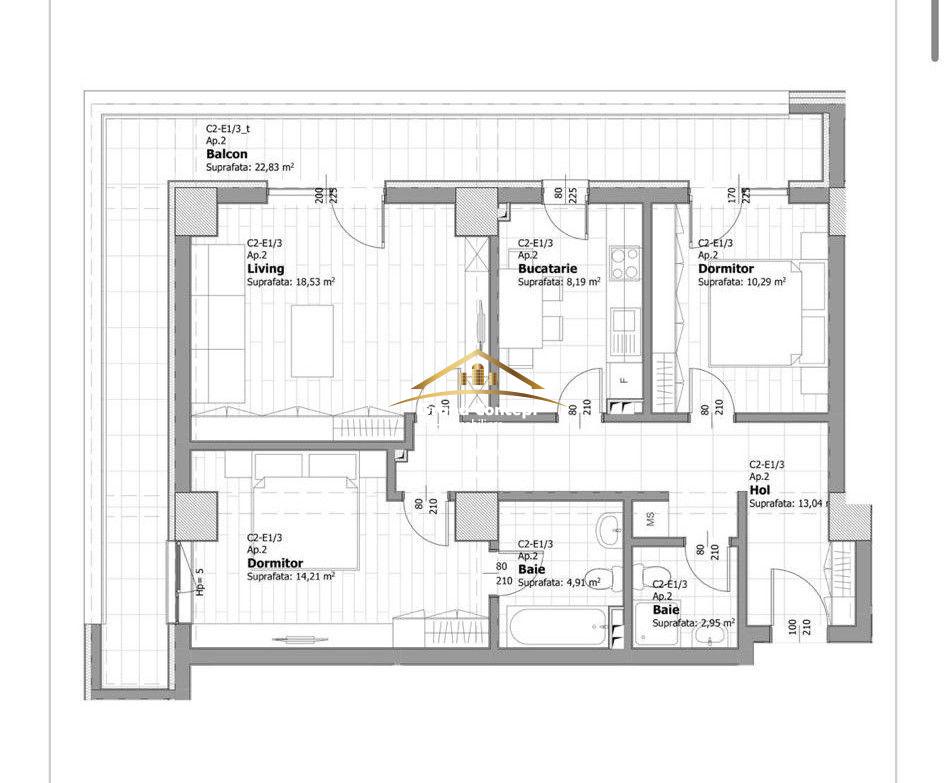Compartimentare: Living – 18.53 m² / Dormitor – 10.29 m², Dormitor – 14.21 m² Hol – 13.04 m² / Bucătărie- 8.19 m² / Baie- 4.91 m², Baie- 2.95 m², Balcon – 22.83 m².
