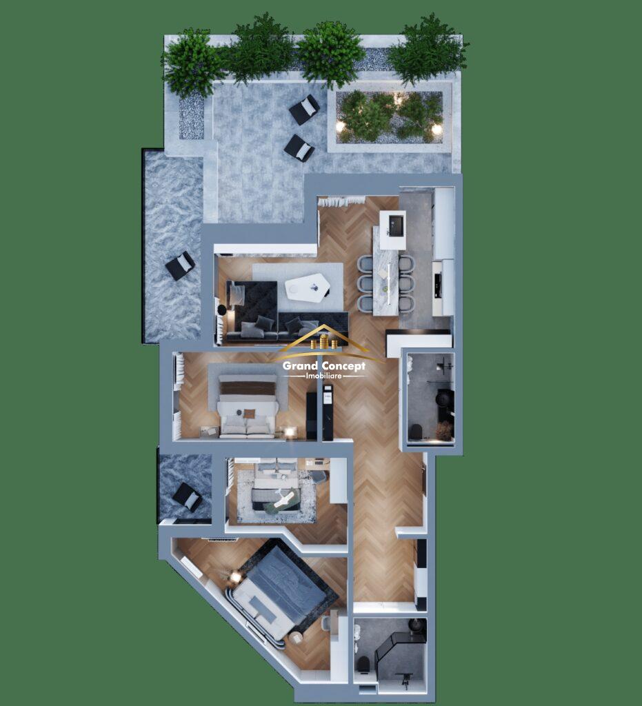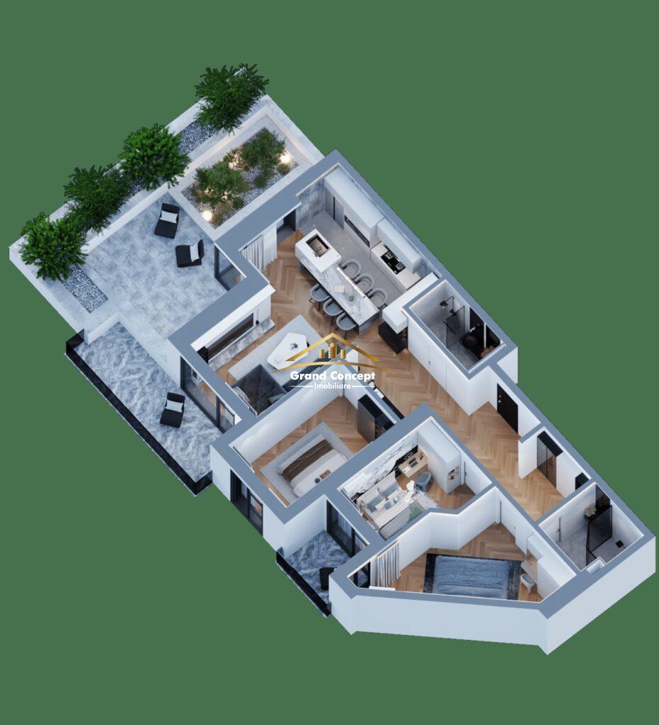 Living +Bucatarie 33.25 mp, Dormitor 16.10 mp, Dormitor 10.40 mp, Dormitor 12.95, Baie 4.30, Baie 5.35 mp, Hol 19.50 mp, Balcon 11.50 mp, Balcon 4.05 mp si Terasa cu Gradina 40.65 mp.