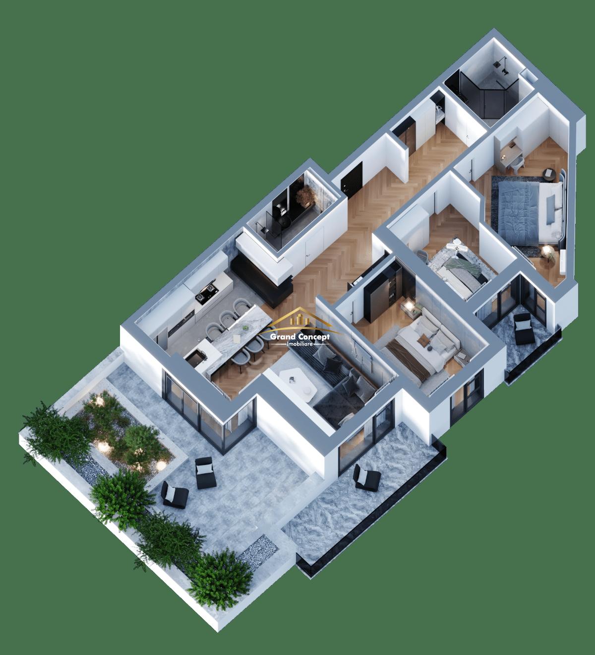 Living +Bucatarie 33.25 mp, Dormitor 16.10 mp, Dormitor 10.40 mp, Dormitor 12.95, Baie 4.30, Baie 5.35 mp, Hol 19.50 mp, Balcon 11.50 mp, Balcon 4.05 mp si Terasa cu Gradina 40.65 mp.
